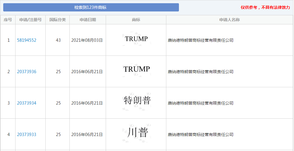 正式宣布角逐2016年美國總統(tǒng)大選后,2016年4月15日,特朗普進行了新一輪中國商標布局,申請注冊與“DONALD J.TRUMP”有關的中英文商標,包括“唐納德·特朗普”“唐納德·川普”“川普”“DONALD TRUMP”“TRUMP”等41個商標。而截至目前,唐納德特朗普商標經(jīng)營有限責任公司在中國的商標數(shù)量為123件。